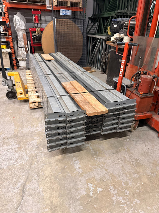 Pallet rack beams connect upright frames and support pallet loads within a racking system. Our inventory includes used pallet rack beams in multiple lengths and capacities suitable for standard warehouse pallet storage. These beams are commonly used when repairing existing racks or expanding pallet rack rows.