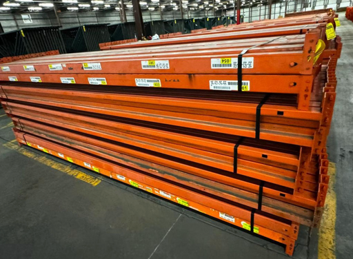 Pallet rack beams connect upright frames and support pallet loads within a racking system. Our inventory includes used pallet rack beams in multiple lengths and capacities suitable for standard warehouse pallet storage. These beams are commonly used when repairing existing racks or expanding pallet rack rows.